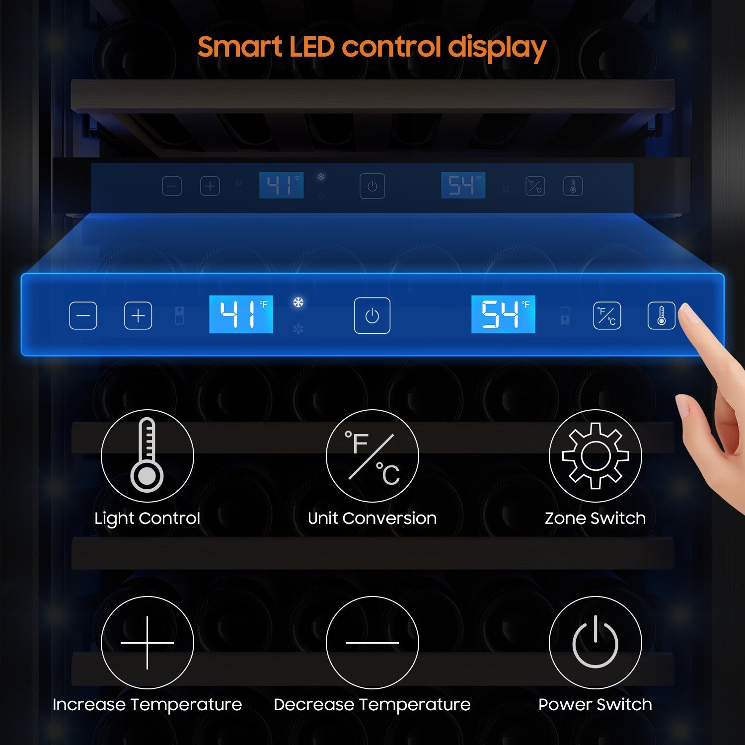 - Precision Cooling with Independent Dual Zones for Wine Enthusiast:Can store up to 177 bottles of standard Bordeaux (750 ml) wine, Our Wine fridge has a dual-zone storage space, The upper zone ranges from 41 F to 54 F while the lower zone is between 54 F to 64 F.Treasure your different wine collections.